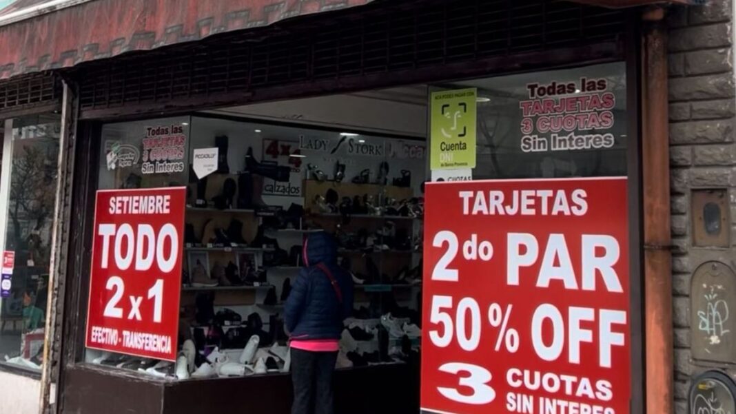 Jorge, el dueño de la zapatería decidió lanzar 2×1 en toda la tienda abonando en efectivo o transferencia el de mayor valor. “La promo es sólo por septiembre, es volumen de venta y atrae porque vendemos la mercadería al costo pero no nos alcanza para los gastos”, indicó.