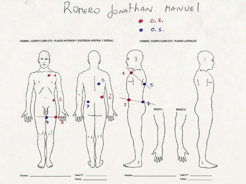 Este recorrido generó una hemorragia interna masiva —un hemotórax bilateral— que derivó en un shock hipovolémico. Según los forenses, esa fue la causa directa de la muerte. El análisis pericial incluye un esquema corporal que marca los puntos de impacto distribuidos en el tórax, abdomen, zona lumbar y muslo izquierdo.